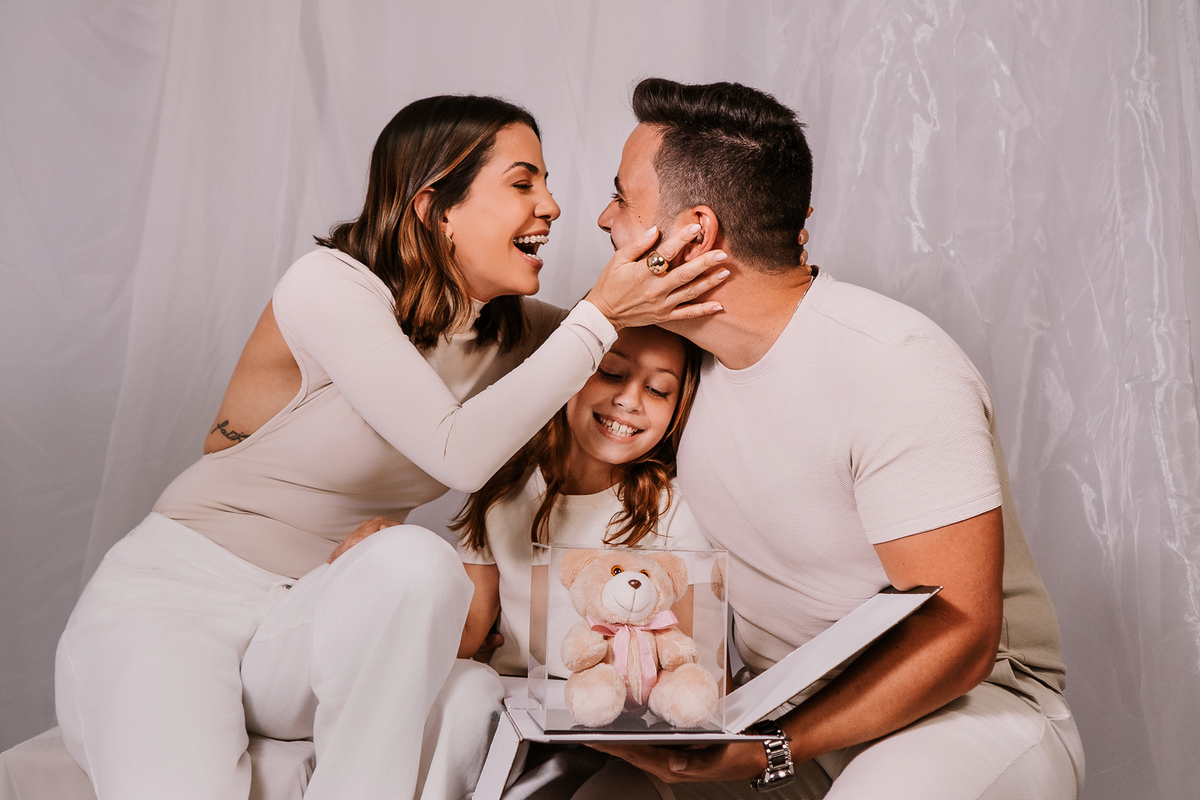 Esse encontro trouxe luz para cada detalhe. A energia dos familiares, os abraços que falam sem palavras e os olhos que brilham antes mesmo de receber a notícia. Como fotógrafos, é bonito ver quando o afeto se manifesta de forma natural.